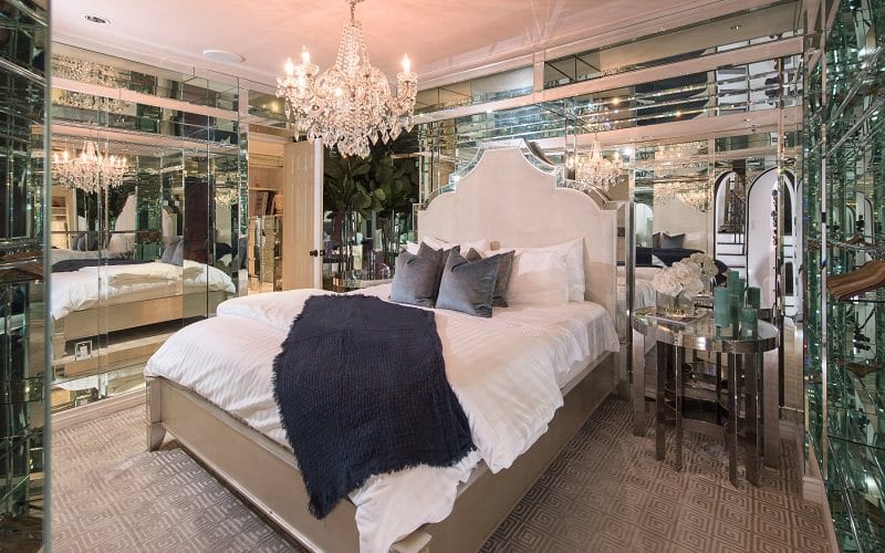 Sleeping in this bedroom must have been an experience. Everything looks so fragile – we’d be afraid of breaking something. The room certainly likes its use of glass with every inch of the walls covered in mirrors.