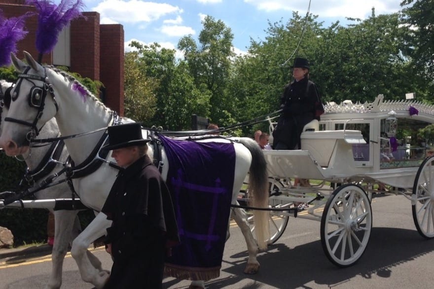 Her small coffin was carried into the local Gilroes Cemetery by a horse-drawn carriage, giving the whole thing a fairytale like ambiance. Mourners were clutching balloons – purple, naturally.