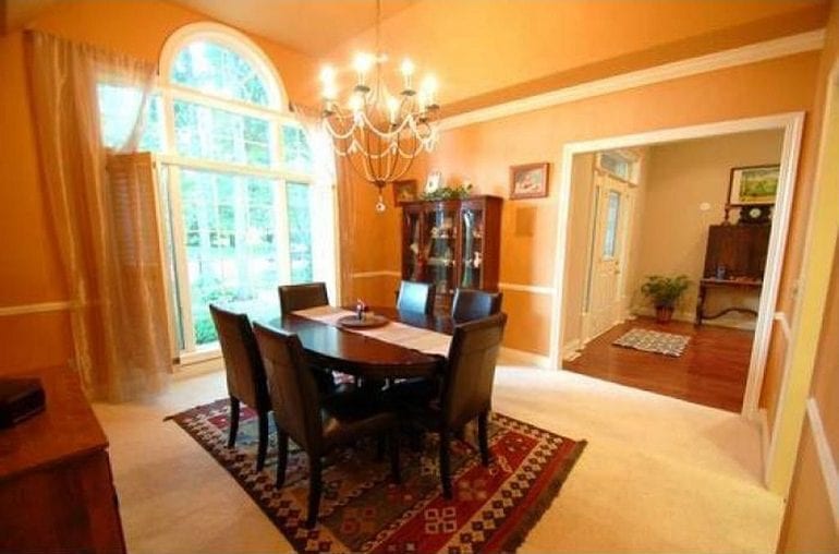 Just at the entrance of the house was one of the many hidden rooms in this property. However, Brett seemed determined to make his dining room stand out from the rest of the home thanks to the bright orange walls.