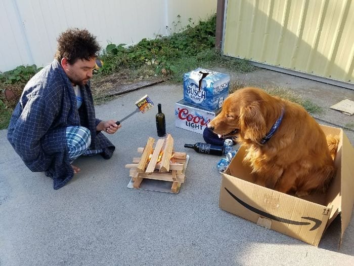 Este esposo decidió demostrarle a su esposas, por medio de fotos, lo mucho que la necesitaba en su vida cuando ella se encontraba de viaje por negocios. Este chico decidió tomarse una foto con su perro con una apariencia muy peculiar. El chico lucía bastante despeinado y calentando en una pequeña fogata, un enlatado. En la parte superior de la foto escribió: “Mi esposa se encuentra en un viaje de negocios, día 14”. Sentimos mucha pena por este señor.