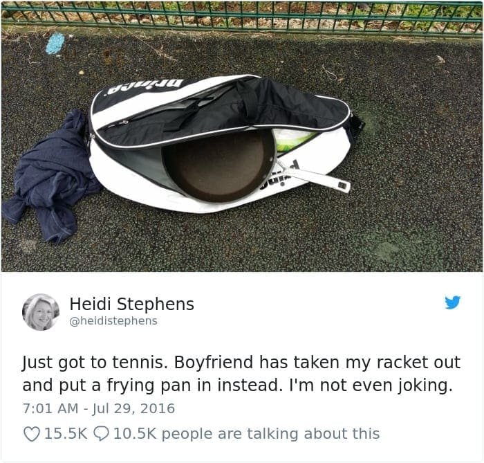 Imagínense salir a practicar deporte al aire libre, vestirse y preparar el bolso con todo lo necesario, pero cuando llegas al lugar, o en este caso la cancha, te das cuenta que simplemente no puede practicar el deporte como deseabas. “Acabo de llegar a jugar tenis. Mi novio decidió sacar mi raqueta de tenis y colocar en su lugar una sartén, no estoy bromeando”. Seguramente la chica al llegar a casa, decidió utilizar la sartén para algo más que cocinar.
