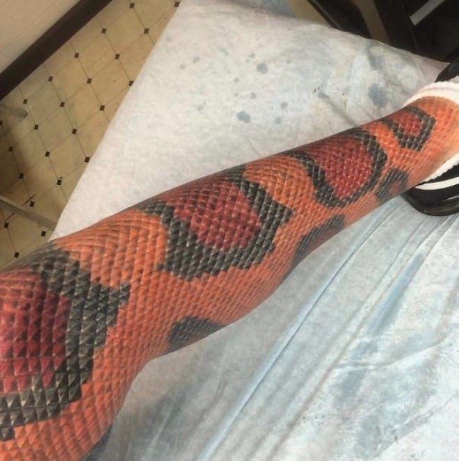 Este tatuaje es seguramente uno de los más impresionantes que verán en esta lista. Por alguna extraña razón, esta mujer quería tatuar su pierna para parecerse a escamas de serpiente.