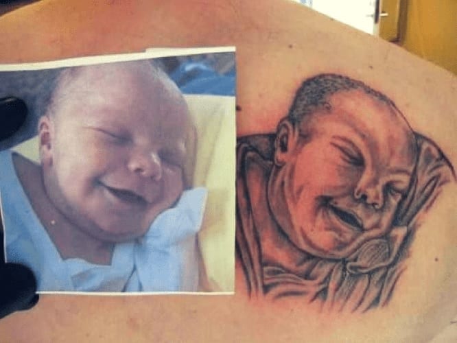 Este padre o esta madre deseaba guardar para toda la vida este hermoso recuerdo de su hijo, cuando este se encuentra con los ojos cerrados y sonriendo. Habrán pensado que la mejor forma de hacerlo era mediante un tatuaje, pero los resultados no fueron lo que esperaban.
