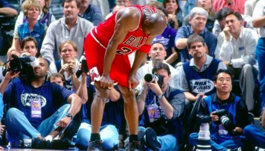 Jordan showed up to the fifth game in the final series of the NBA championship with his Bulls side locked at 2-2 against the Utah Jazz. The game was being played in Utah and on the morning of the big game in Salt Lake City, Jordan was curled over in his bed. Fans were tuning their television sets into the big game and were greeted with the news that the main star was struggling.