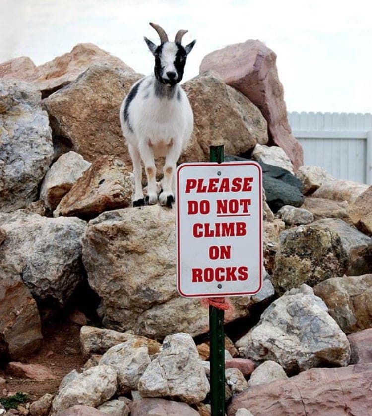 We can’t actually blame this cute goat for breaking the rules, since she most likely can’t read the sign telling her not to climb on the rocks. She’s probably just following her natural instinct to get to a higher vantage point.
