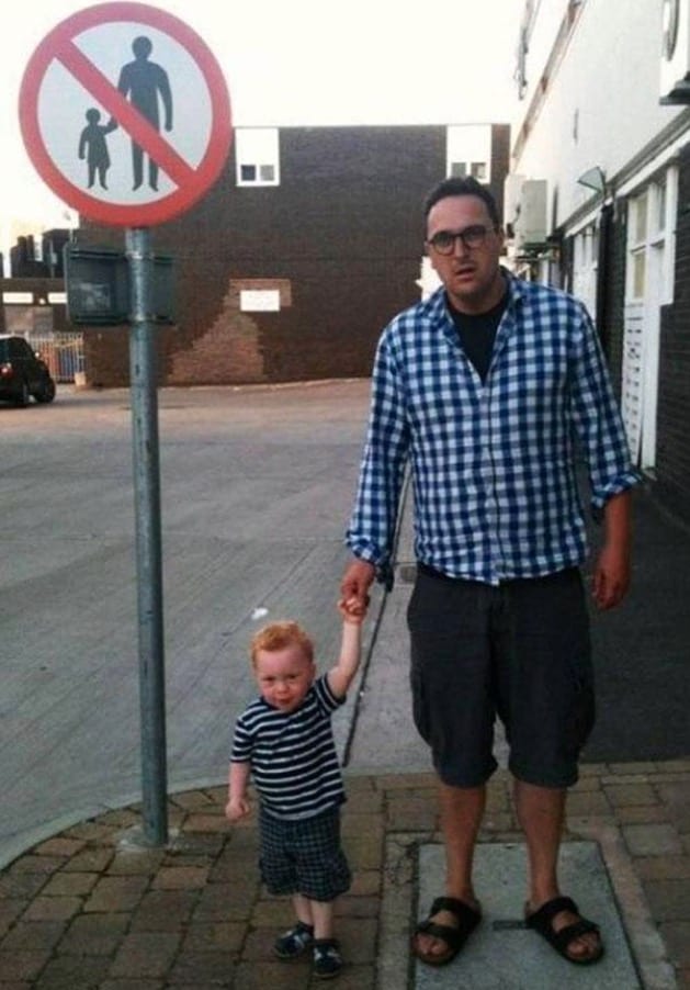 In that case, you would probably look at this particular sign and think that it was saying no men walking hand-in-hand with their sons allowed. This father and son pair perfectly imitated the pose in the picture on the sign, and stood right next to it. We know that this isn’t exactly what the sign means, but it sure is funny.