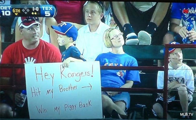 His sign says that if they hit his brother, he’ll give them the contents of his piggy bank. His parents look utterly unconcerned that he wants his own brother to get hit by a baseball, and his brother doesn’t look too worried, either. We’re not sure how much money is in his piggy bank, but the question remains – is it worth it?