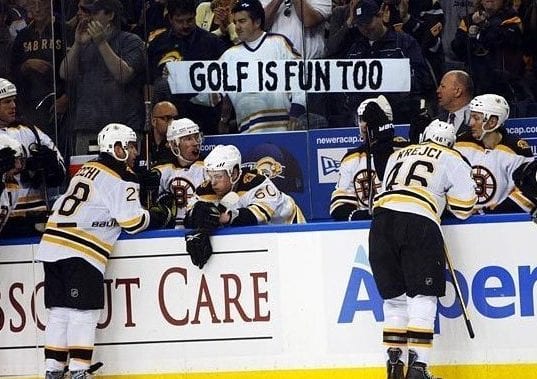 We’re not arguing, golf can certainly be a fun sport, but he is nowhere near a putting green, and he seems to have gotten his sports mixed up. The sign is bound to cause some confusion on the ice, since it’s been placed in a prime position for the hockey players to see.
