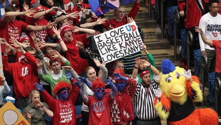 The Dayton Flyers fans holding up this sign aren’t rooting for any particular basketball player, but instead are asserting their love for University of Dayton basketball in general.