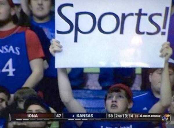 Instead, he’s simply all about “Sports!” We think it’s nice that he likes sports so much, but he may be missing the point of holding up signs at games. As long as he’s having fun, we guess it doesn’t matter too much.