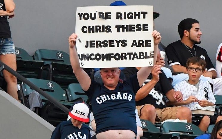 He said that the jerseys were uncomfortable, so he cut the collars. This fan offered Sale support with a sign reading, “You’re right Chris, these jerseys are uncomfortable,” while wearing a midriff baring shirt several sizes too small. Not exactly what anyone might expect to see in the stands, but funny nonetheless.