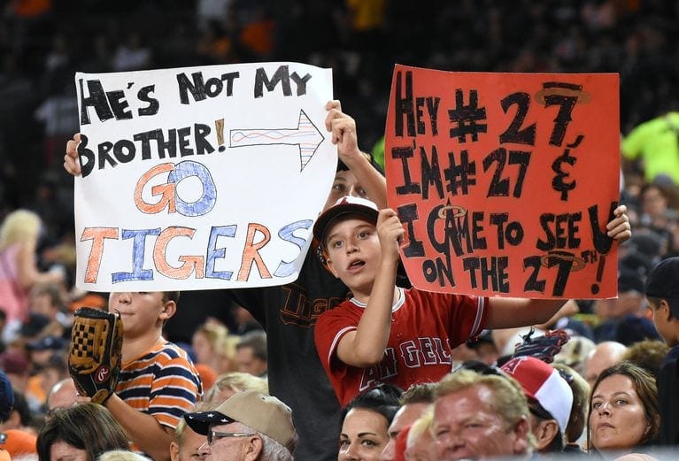 On the right we have a Los Angeles Angels fan, who came especially to support Mike Trout, with whom he shares a number. On the left, we have a Detroit Tigers fan, who wants to disavow any connection with his brother. We are impressed that they can sit next to each other (relatively) peacefully at a game like this!