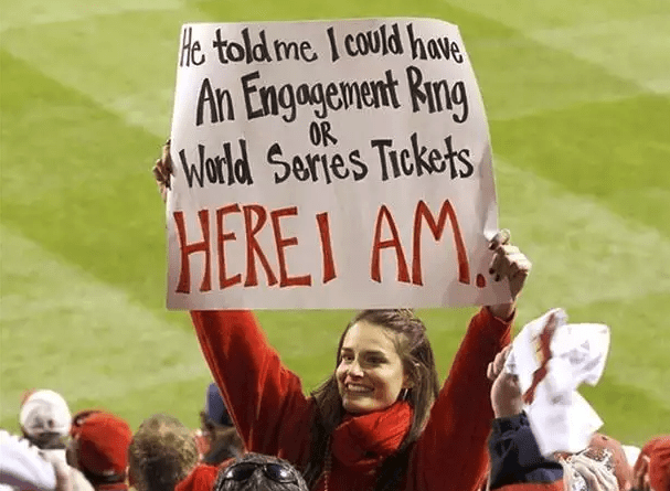 Before the 2011 World Series between the St. Louis Cardinals and the Texas Rangers, she and her boyfriend of four years were talking about the possibility of marriage. She really wanted a ring, but then her boyfriend offered her tickets to the World Series instead and she accepted – promising to never bring up marriage again. And she sure got a lot out of this decision. She got to see the very dramatic Game 6 of the 2011 World Series, and the picture of her sign went viral.