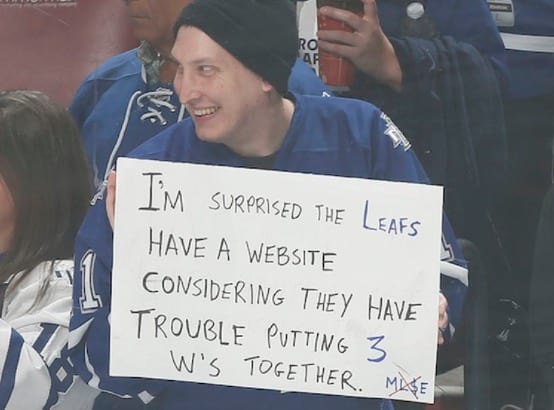 This fan was disappointed in the Toronto Maple Leafs’ failure to achieve a winning record comprised of three games, and did what he thought best: made a sign that cleverly insulted his own team.