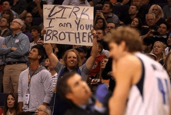 That’s one way to surprise a basketball player in the middle of a game! This fan whipped out a sign claiming to be NBA star Dirk Nowitzki’s brother, perhaps hoping to distract him during a key moment on the court.