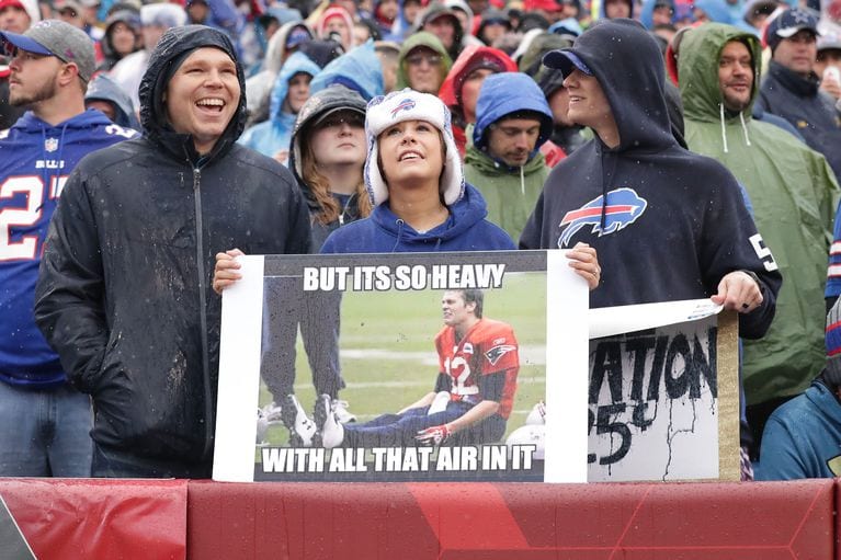 They seem to make all other football fans feel better about how many Super Bowls Tom Brady has actually won. In this case, these Buffalo Bills fans are referencing Brady’s 2015 “Deflategate” scandal, in which the Patriots were deflating footballs, which is against the rules. These cold Bills fans are making fun of sad Tom Brady and the football scandal at the same time. Nice one.
