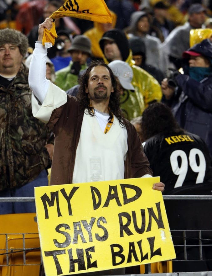 Dressed like Jesus and asserting that he’s giving advice from his dad (read: God), he is telling his football team to run the ball. If he really is speaking for god, the Steelers would do well to listen to his advice. Although if god truly were supporting them, you might think that they would have won a Super Bowl since 2009.