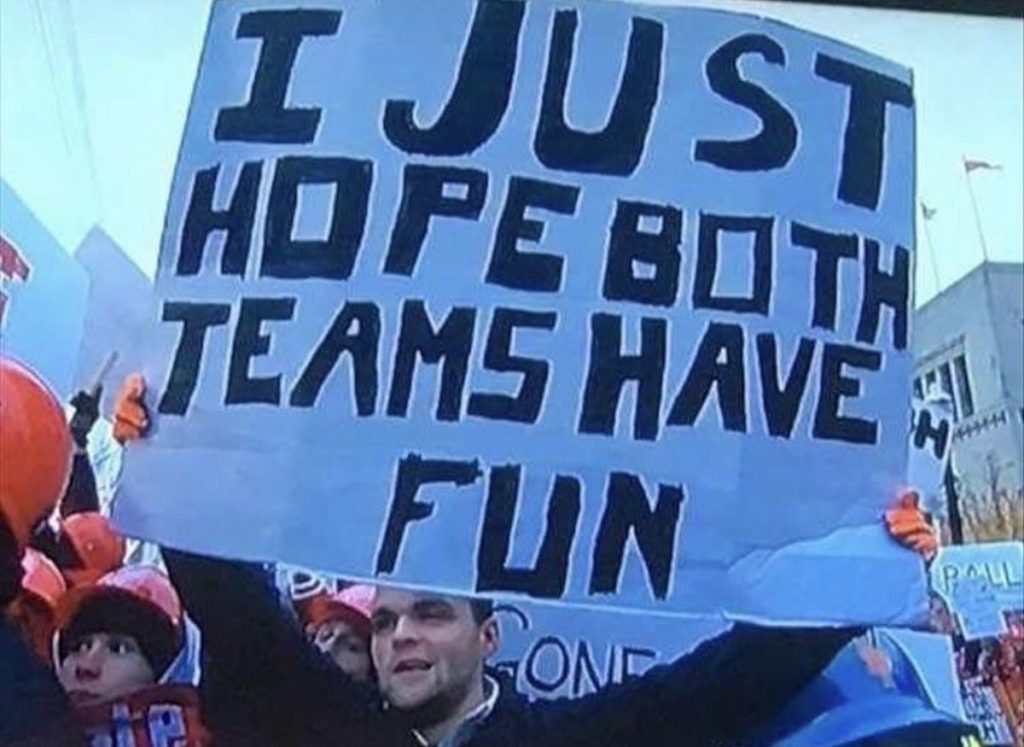 This fan, however, goes against the grain with his sign. He’s definitely not your typical ardent sign-writing sports fan with this huge sign reading: “I just hope both teams have fun.” Perhaps he has a point though, because, after all, isn’t having fun what sports are all about?