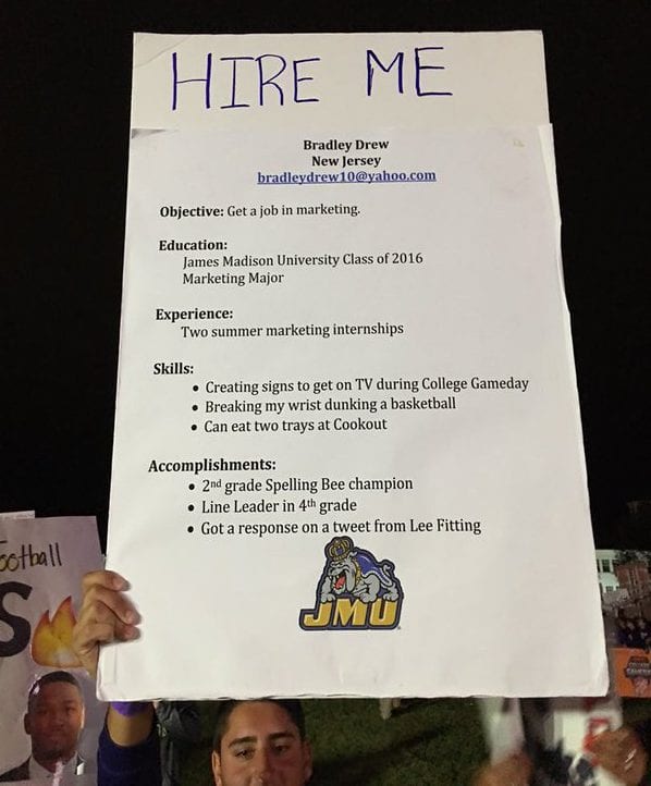 This James Madison University student had only one goal in mind when he made his sign for the game: get a job. We know, the job market is tough for a recent college grad, so why not give this unorthodox method a shot?