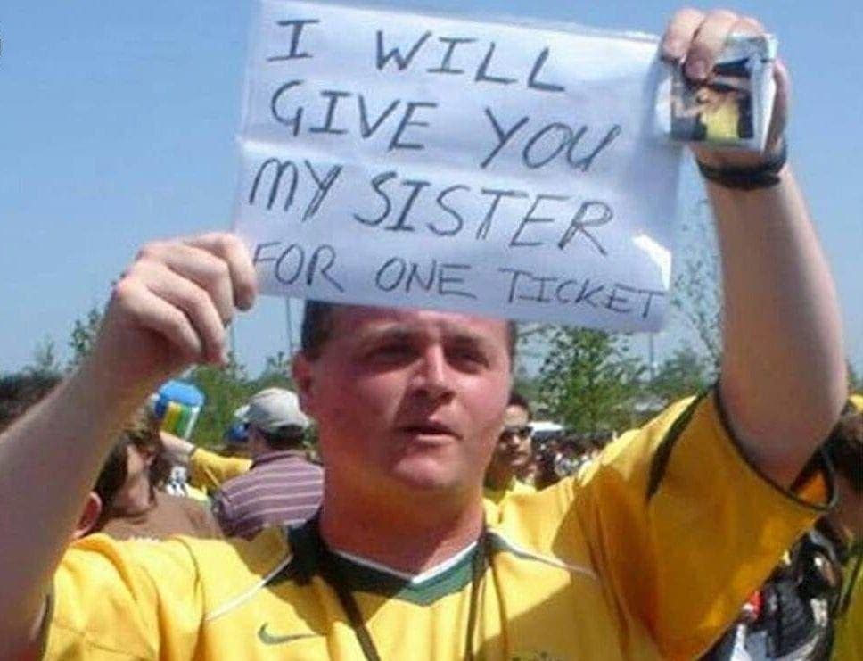 Yep, he was more than happy to sell his sister as long as he could go watch the game. What makes this even more spectacular is the fact he actually carried a little photo of his sister around with the sign. We wonder if he actually managed to strike a deal with anyone?