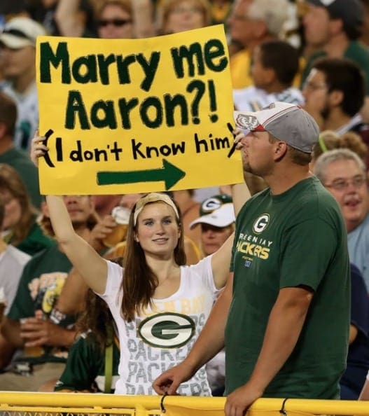 She’s already claiming that she doesn’t know the guy she came to the game with (her boyfriend? Husband?) and her sparkly “Marry me Aaron” sign is definitely attracting a lot of attention. Sure, Aaron Rodgers might be quite a catch, but we don’t imagine her partner is loving this sign.