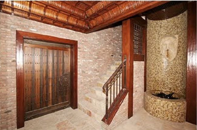 From this photo, we can assume that they have a basement area that they have transformed into something very special. Located underneath the main house, it seems as though they have a wine cellar to their name. From the dark wood door to the intriguing water feature, this seems like somewhere we could spend a lot of our time.