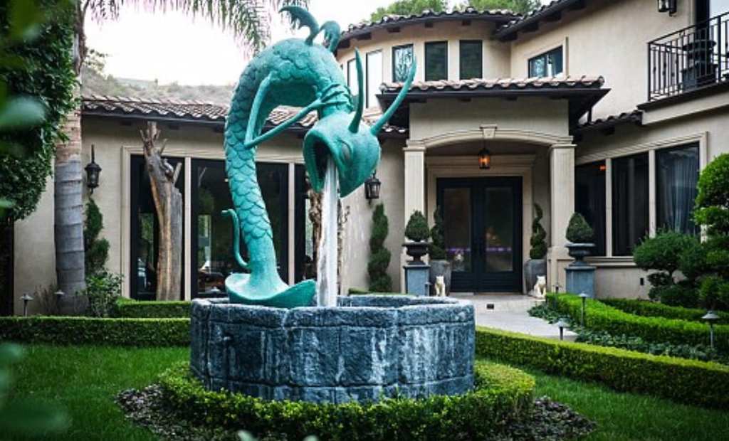 In the front garden of Jordan’s house, there sits a marine green colored fountain statue of some sort of serpent-like creature.