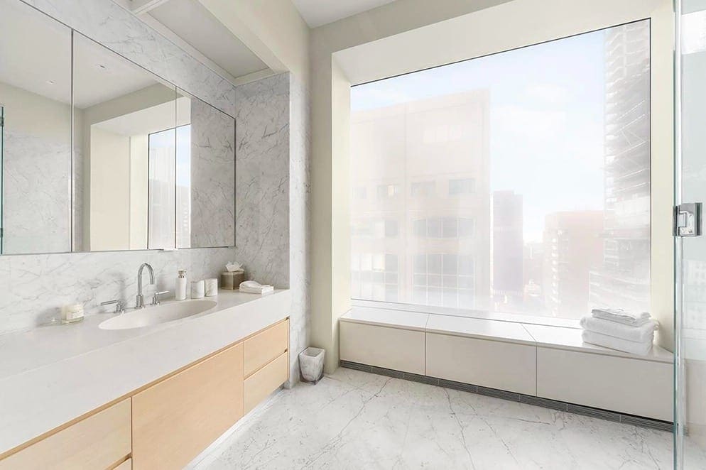 The bathrooms of the Park Avenue abode are just as fabulous as the rest of the apartment. With divine white marble sheathed walls and floors, a large east-facing frosted window, and plenty of mirrors and cabinet space, this master bathroom next to the master bedroom looks like a page out of an elite lifestyle magazine.