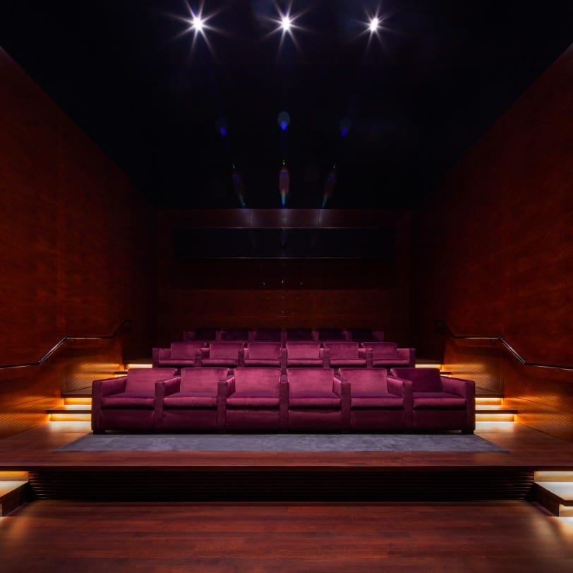 The screening room is designed to accommodate film screenings and special events such as televised sporting games, private recitals, and lectures. The red velvet seats and wood-paneled floors and walls provide for a remarkable and quite extravagant viewing experience