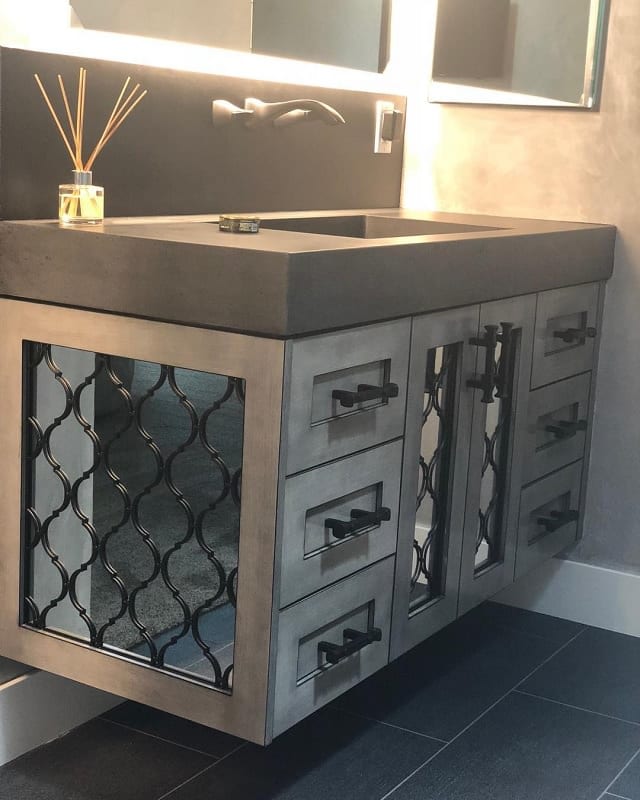 However, the additions are in the details. The star has used mirrors mixed with wrought iron to create the panels on the side. Plus, the whole thing is topped off with a concrete top and light up mirror – it’s perfect.