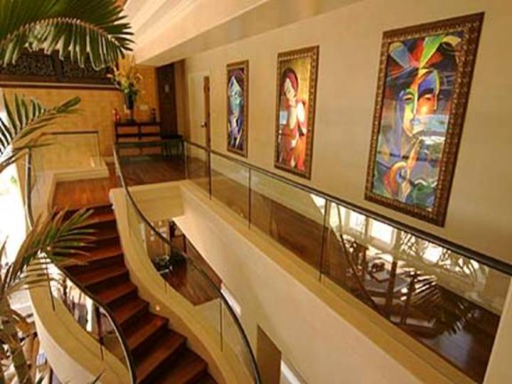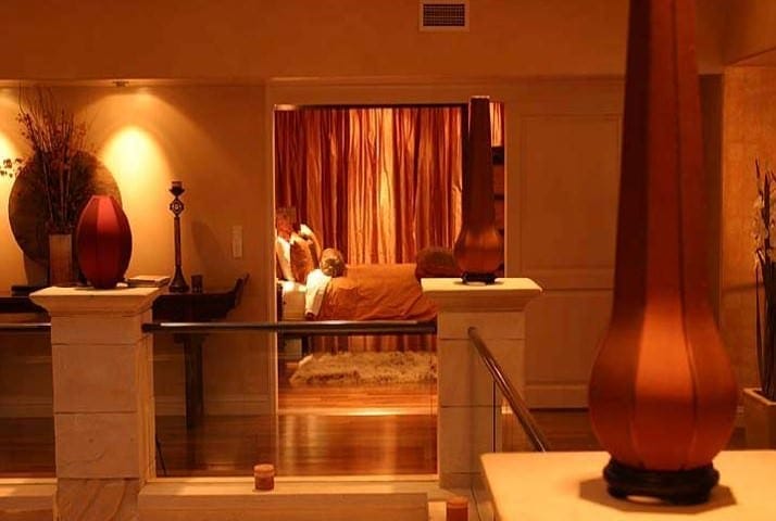 The top floor is dimly lit to create a romantic atmosphere in this beach house. Woods has gone with a rust-colored theme to make it feel more homely than perhaps a beach house often does.