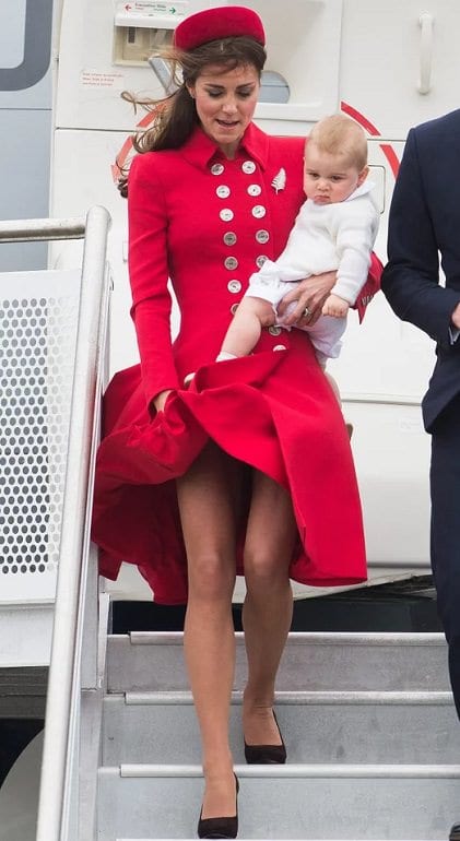The Duchess has been seen to break many of the rules set by the other Royals over the years, including the one that states you shouldn’t fly with all of the family members on one plane in case something happens. Who needs safety precautions, right? Sadly, with her arms full of baby, it looks as though Kate is a hand down to save her modesty.