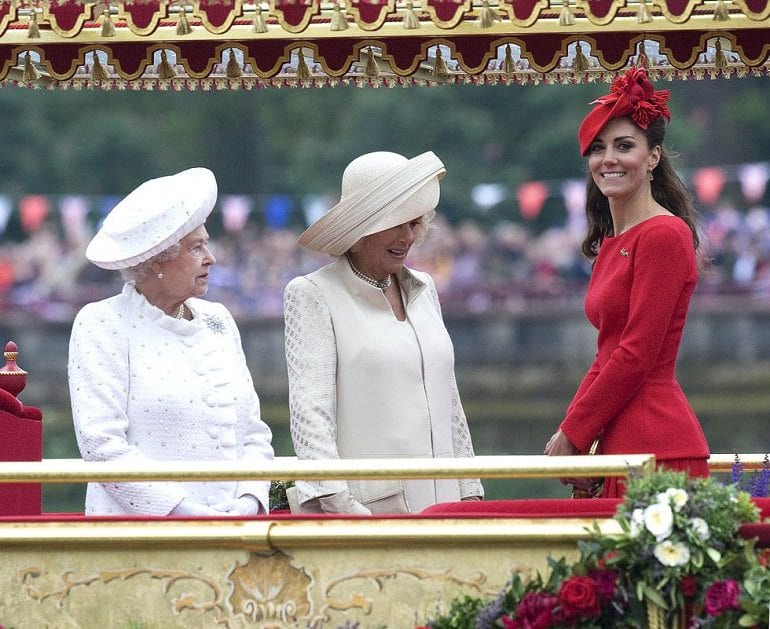 Unfortunately, it looks as though Kate missed out on the crucial memo of the color scheme. The Queen and Camilla look ready to rock in their white outfits, while Kate is stealing the show in more ways than one. Just smile and wave, Kate, smile and wave.