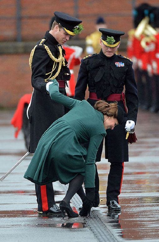 Those stilettos might seem like a good idea, but they come with their drawbacks – especially when there are small holes involved. Thankfully, Kate had the help of Prince William to try and free her shoe. Isn’t it meant to be left on the steps of a castle for the prince to find, not stuck in a drain?