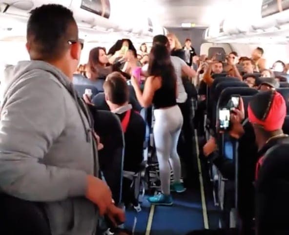 Estos pasajeros sacaron sus palomitas de maíz juntos a sus teléfonos móviles para poder grabar una pelea entre dos pasajeros. Esperemos que todo se haya arreglado en cuestión de segundos y que no hayan llegado a las manos.