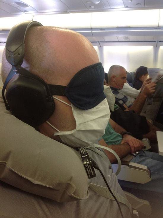 Este señor deseaba llegar muy saludable a su destino y no iba a permitir que nadie lo infectara con ninguna bacteria, por eso, decidió colocarse un tapabocas. Suponemos que los tapa ojos son para evitar cualquier luz dentro del avión y los audífonos para evitar escuchar a los pasajeros. Solo nos queda desearle al señor un feliz viaje.