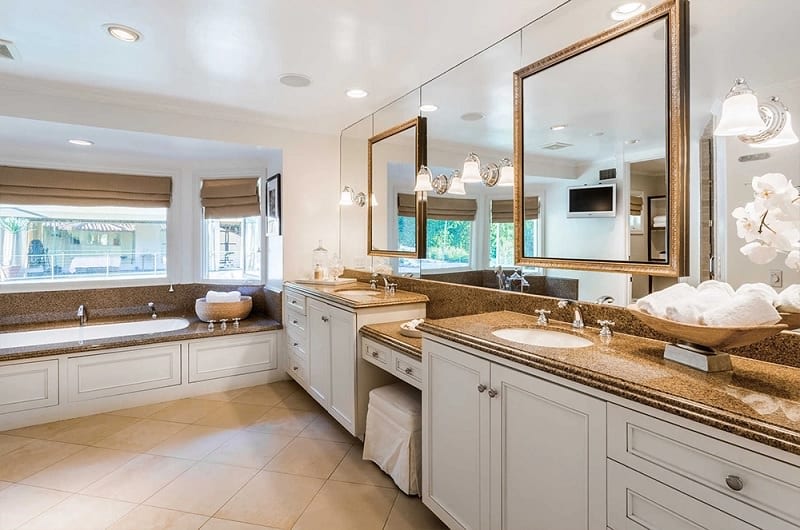 This huge bathroom meant that there was definitely a chance of them taking too long to get ready in the mornings – because it must have been hard to not sit in that tub for hours on end! Gilded in gold, this white and gold bathroom really is something special, and the double vanity cabinets means they probably never got in each other’s way in the morning. They even had a TV in the corner.