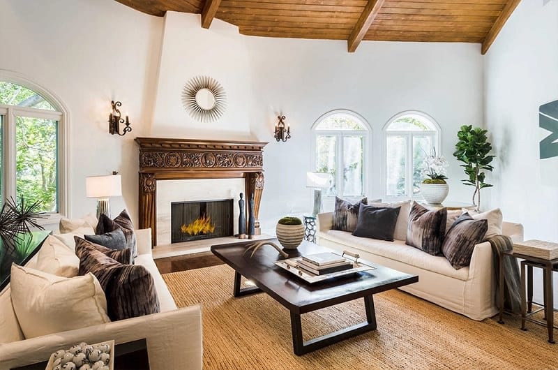 We can imagine that Anna and Chris spent many a lazy Sunday lounging on these couches with their son, Jack, while watching movies on the projection system that they had set up in the corner. With different colored wood and ornate designs adorning the fireplace, this really does showcase their personalities. As if that wasn’t cool enough, have you noticed that the living room is not in the shape of an ordinary rectangle?