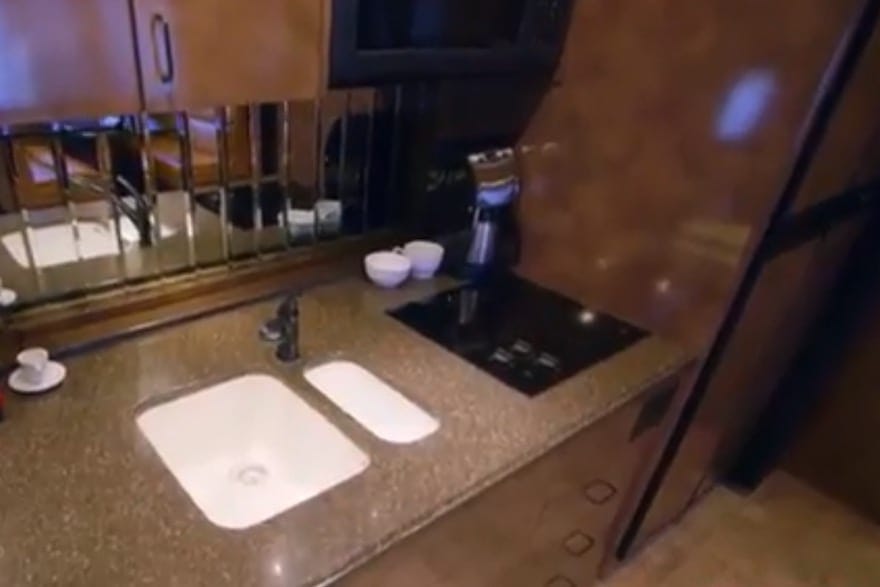 Despite the trailer’s modular width and extreme length, it was made with one simple mindset – maximizing whatever space there is so it never feels cramped or tight. The kitchen is a very good example of that frame of mind, as pretty much everything in it is built-in – from the fridge to the stovetop and even the dishwasher. Everything fits into its own recess, so that nothing takes away from the space people have to move around and mingle.