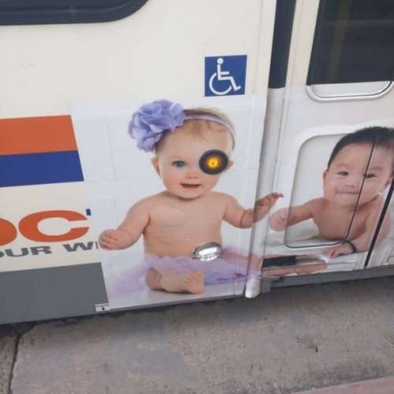Esta empresa tenía una gran y adorable idea de colocar fotos de bebés para promover algo, lamentablemente al colocar las fotos de los niños, obviaron el hecho de que una luz amarilla se encontraba justo en el lugar del ojo de la pobre bebe. Además de eso, si se fija con mayor determinación encontrarán que inclusive el ombligo de la bebé es de metal. ¿Habremos recibido un mensaje del futuro?, ¿Será que es en realidad la idea de la publicidad?. No lo sabemos con exactitud, pero lo que podemos decirles es que nos encontramos un poco aterrados.