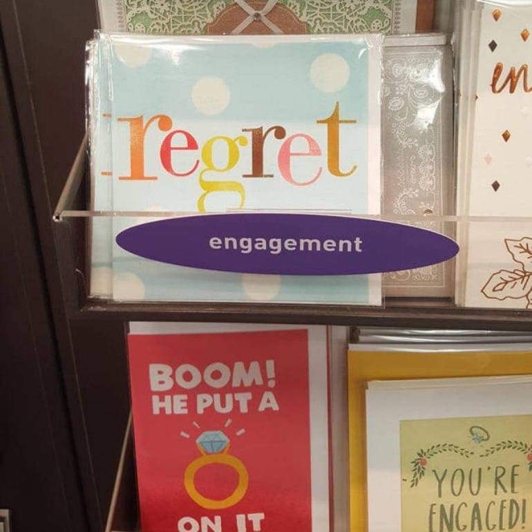 En la estantería de arriba, esta escribo “Compromiso” y la primera tarjeta que se asoma es la de “Arrepentimiento”. Una excelente y divertida forma de mantener a los clientes dentro de la tienda y hacerles pasar un muy buen rato. Solo esperamos que si alguna persona haya decidido comprar una de estas tarjeta, haya sido la correcta.