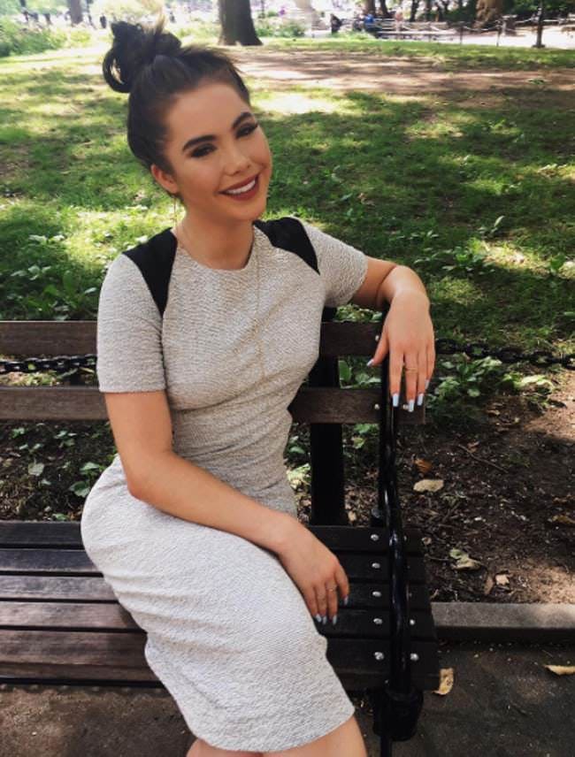 There really is nothing quite as beautiful as a day in the park, is there? Wearing a relatively modest yet fancy dress, McKayla plopped herself down on a local bench in a park, clearly enjoying the fresh breeze and mixture between the glaring sun and the cool shade. With her hair put up in a slightly messy yet elegant bun, she appears to be in a serene and peaceful state of mind, which makes her look all the more endearing.