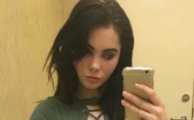 McKayla is certainly a young lady who takes her fashion very seriously, and she is constantly showing the world her evolving sense of it style. In this picture, she wears a unique green top, but what makes it interesting is the wide lacing that runs from her neck down to her belly button, where the shirt ends. Taking the selfie in the mirror with her IPhone, she seems to be either in a bathroom, a hotel room, or even a backstage dressing room.