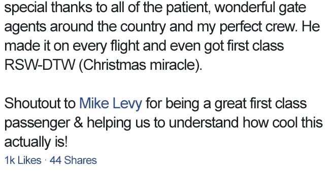 It was because of them that he was able to make all the flights, and even get first class tickets. She also gave a special shoutout to Mike Levy for sharing their story and for understanding how cool her dad is.