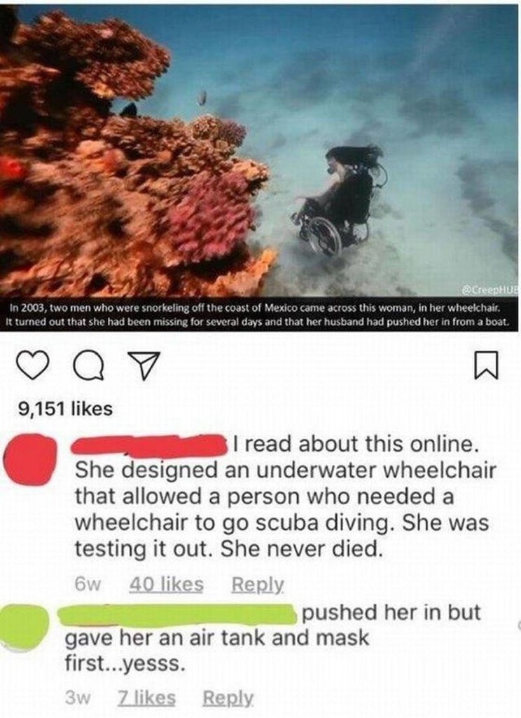 They revealed that the photo was actually of a woman testing out diving gear for people in wheelchairs. Okay, that makes way more sense.