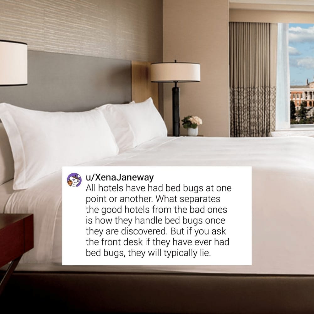 One of the reasons why some people don’t like staying at hotels is because of bed bugs. And no matter what the front desk tells you, all hotels have to deal with those little suckers at some point. What this is saying is to pretty much ignore what they tell you about bed bugs. That’s not to say that bed bugs are always there, it’s just reiterating that at one point or another, they will be. The better hotels will make sure they don’t stay long, though.
