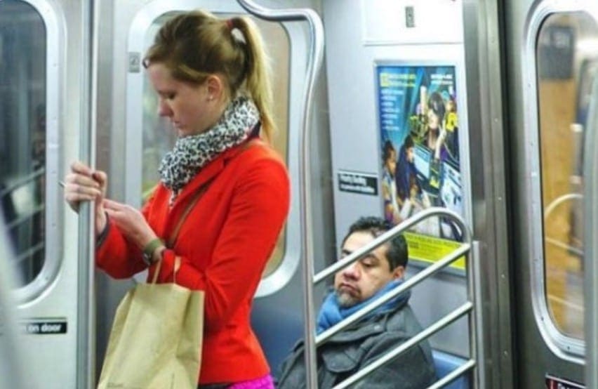 So taken aback, in fact, that he had to stare a little to make sure he wasn’t dreaming. This woman obviously thought nothing of her outfit, and probably didn’t expect to be checked out quite so blatantly, but the person behind the camera caught this man in the act. What, have you never seen a woman in pink underwear on the subway?