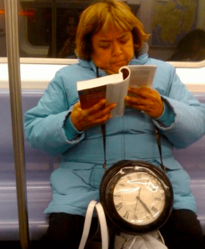 Instead of forcing a strap around her wrist, she decided to mix two items into one and attach a giant clock face to her purse. What a smart cookie. Not only is this beneficial for her, but it’s also beneficial for those who are also riding the subway.