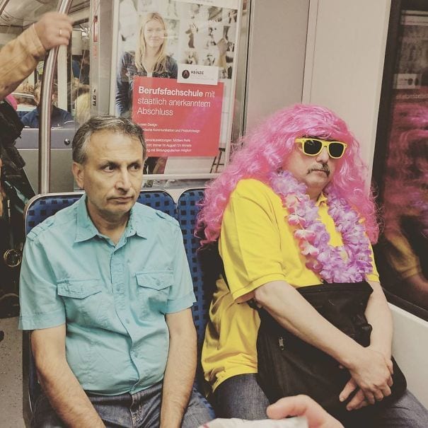 However, it seems as though the man next to him isn’t so sure. He doesn’t look too impressed with his subway mate. From his pink wig and lei combination to the matching yellow shirt and sunglasses, you can’t deny that he has at least thought about his outfit. However, it seems as though the man next to him isn’t so sure. He doesn’t look too impressed with his subway mate.
