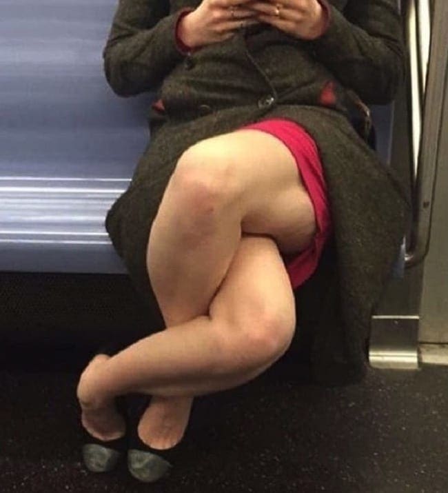 There are those who keep their legs pushed tight against each other because they know it’s a tight squeeze for everyone. There are also those who cross their legs. While this isn’t an unusual sight, this woman certainly is. This photograph makes us cringe a little inside because we just can’t work out what is going on.